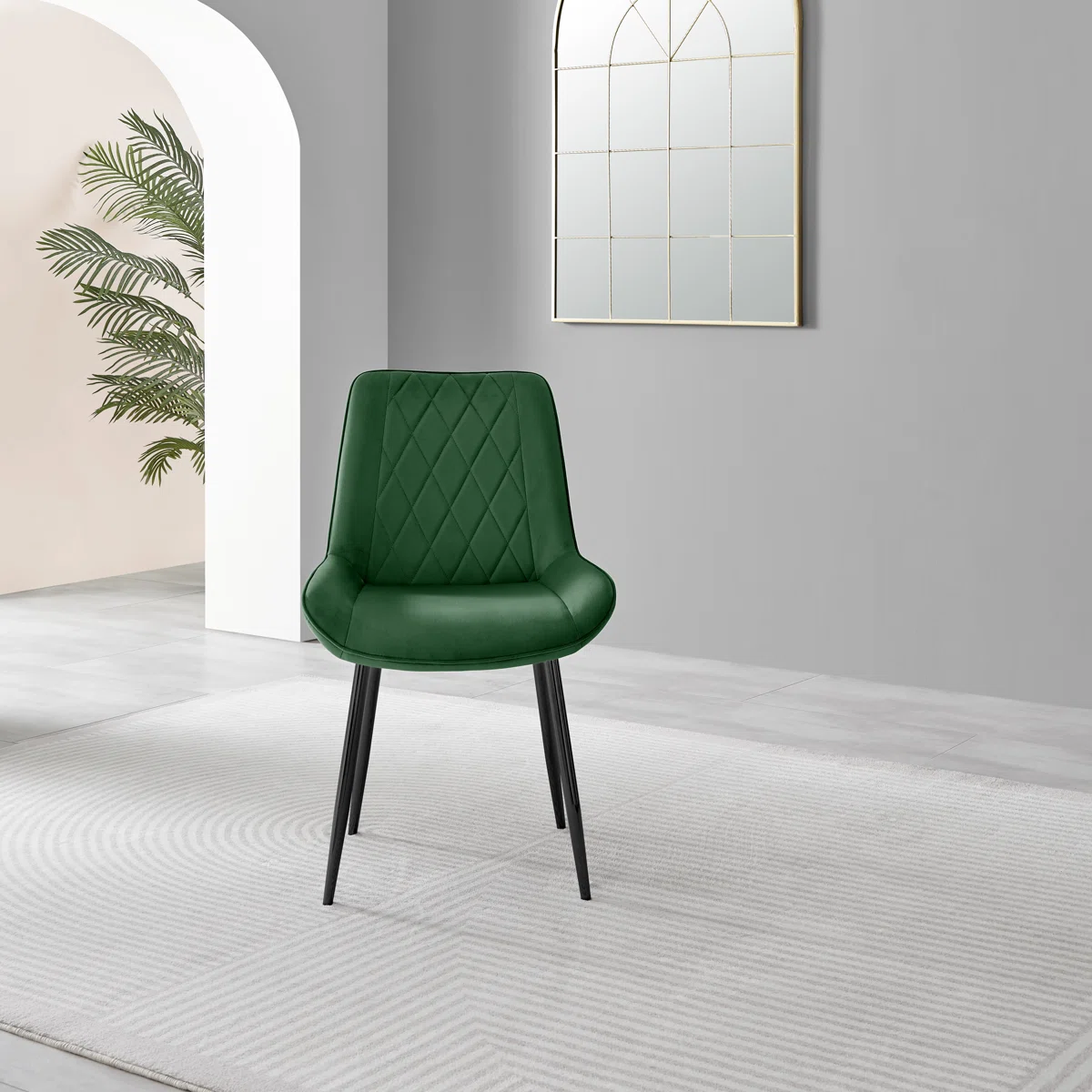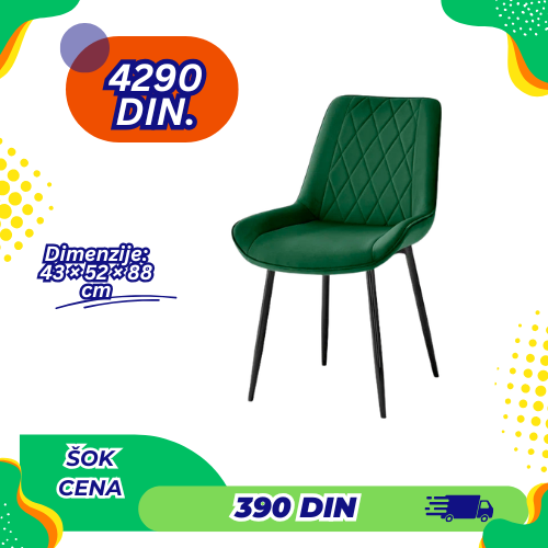 Stolica Verona – Zelena (br. 58 ) – moderna velvet stolica sa stabilnim metalnim nogama. Elegantne boja zelena. Jednostavna montaža (alat i šema uključeni). Idealna za trpezarije, dnevne i radne prostore. Dimenzije: 43 × 52 × 88 cm
